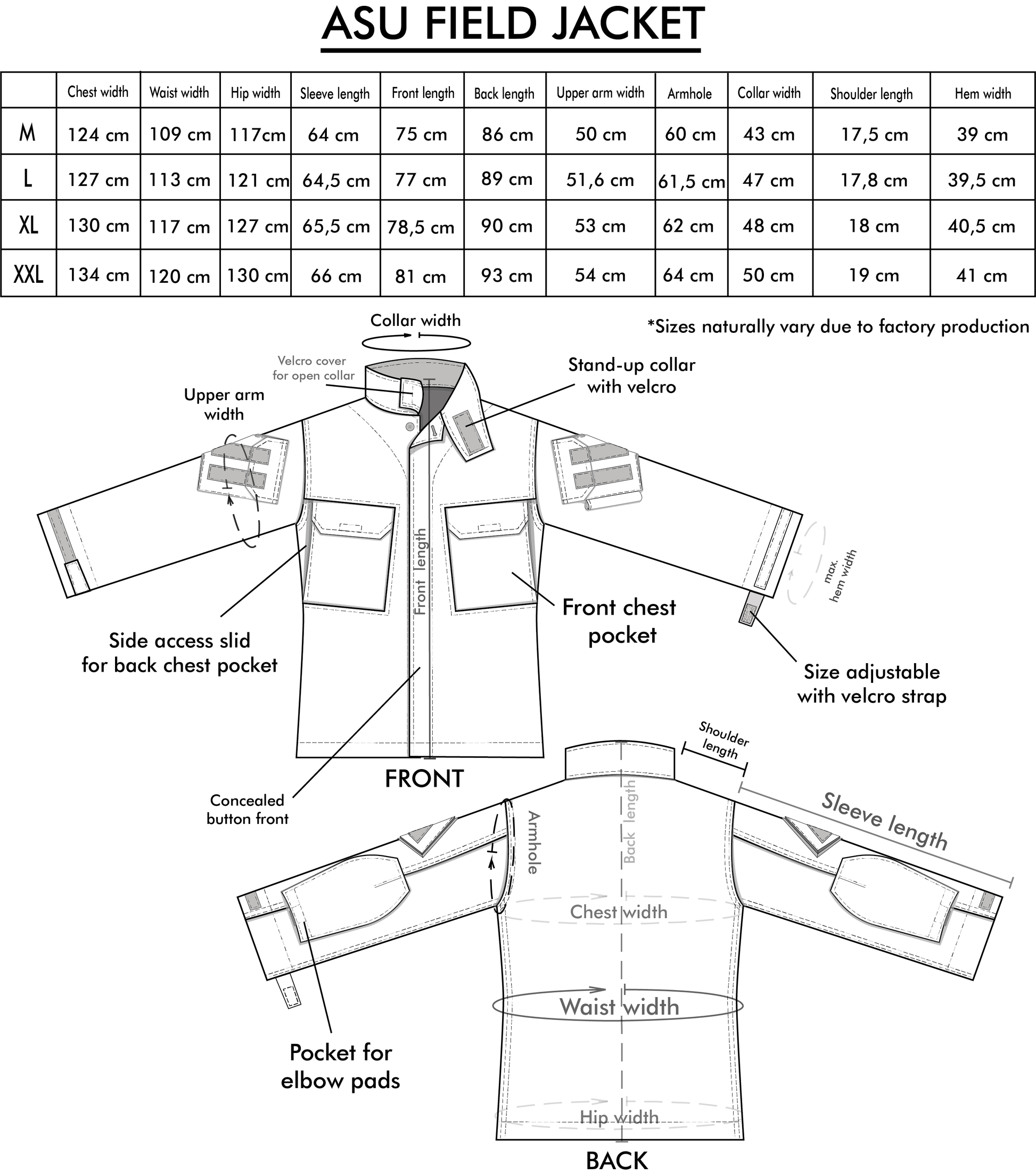 - Arm & front chest pockets.